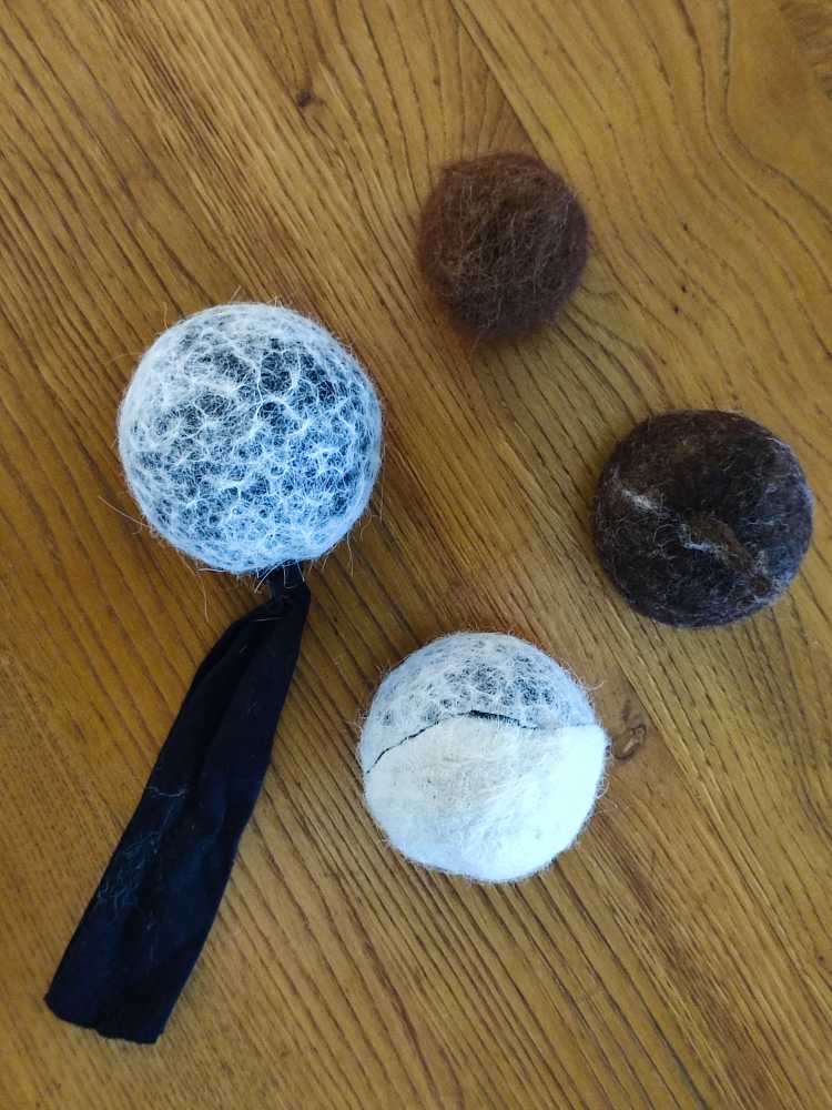 As bolas de tração são feitas com meias recicladas, recheadas com 100% de lã de alpaca feltrada, e as bolas são feitas de 100% de lã feltrada de ovelha ou alpaca.