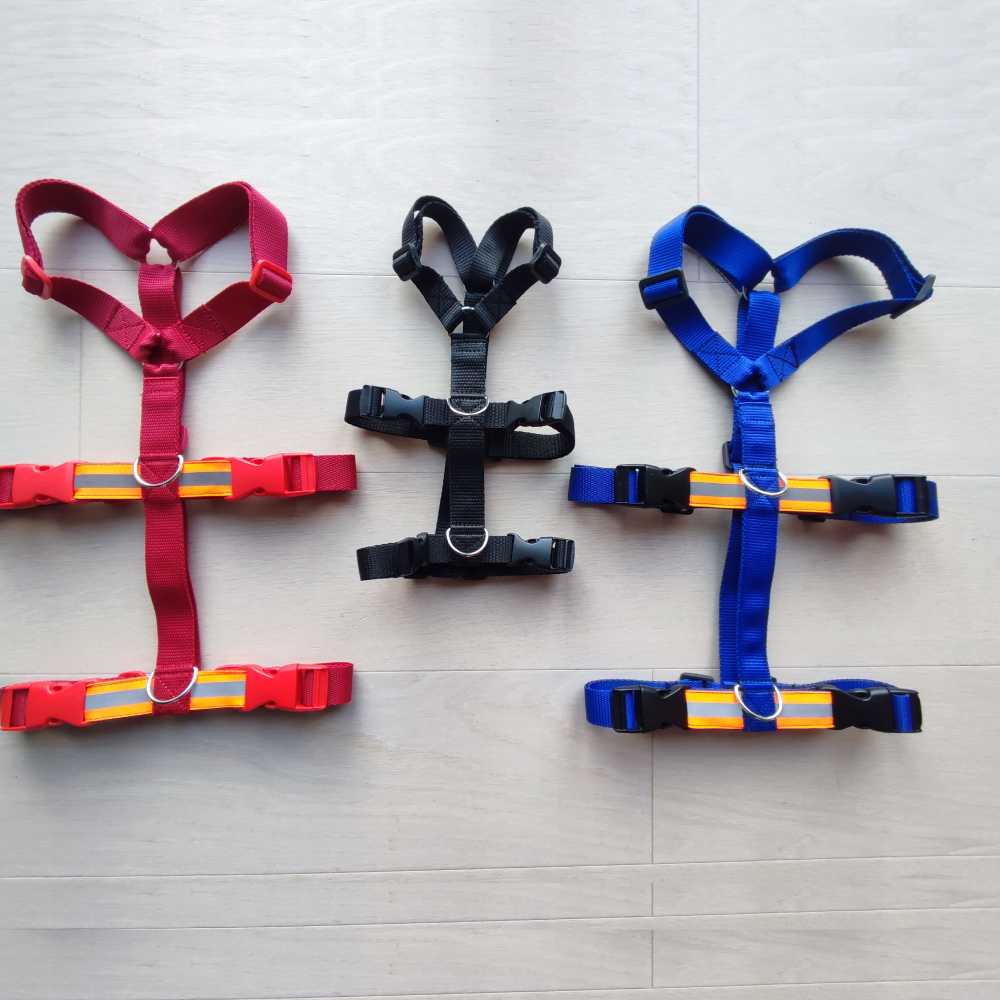 Faço arneses de segurança ajustáveis em 3 tamanhos: S, M e L, e também sob medida, se necessário. O cão castanho usa o tamanho S e o cão bege usa o tamanho M. O tamanho L é adequado para cães como pastores alemães, Serra da Estrela, entre outros.